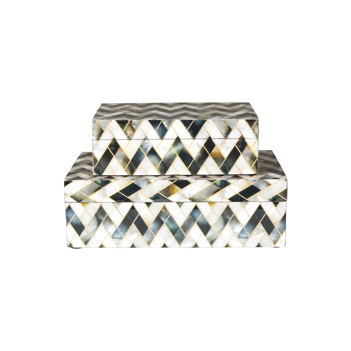 Æskesæt i MDF med smukt zig-zag mønster i sort/hvid/guld farver.