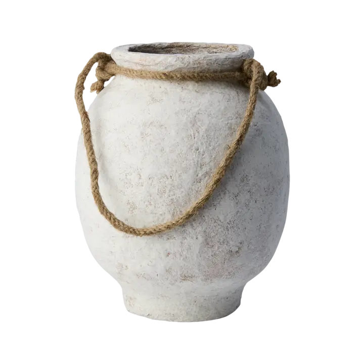 Angus vase i farven beige. Den er vandtæt og håndlavet i bomulds mache men jute snor.