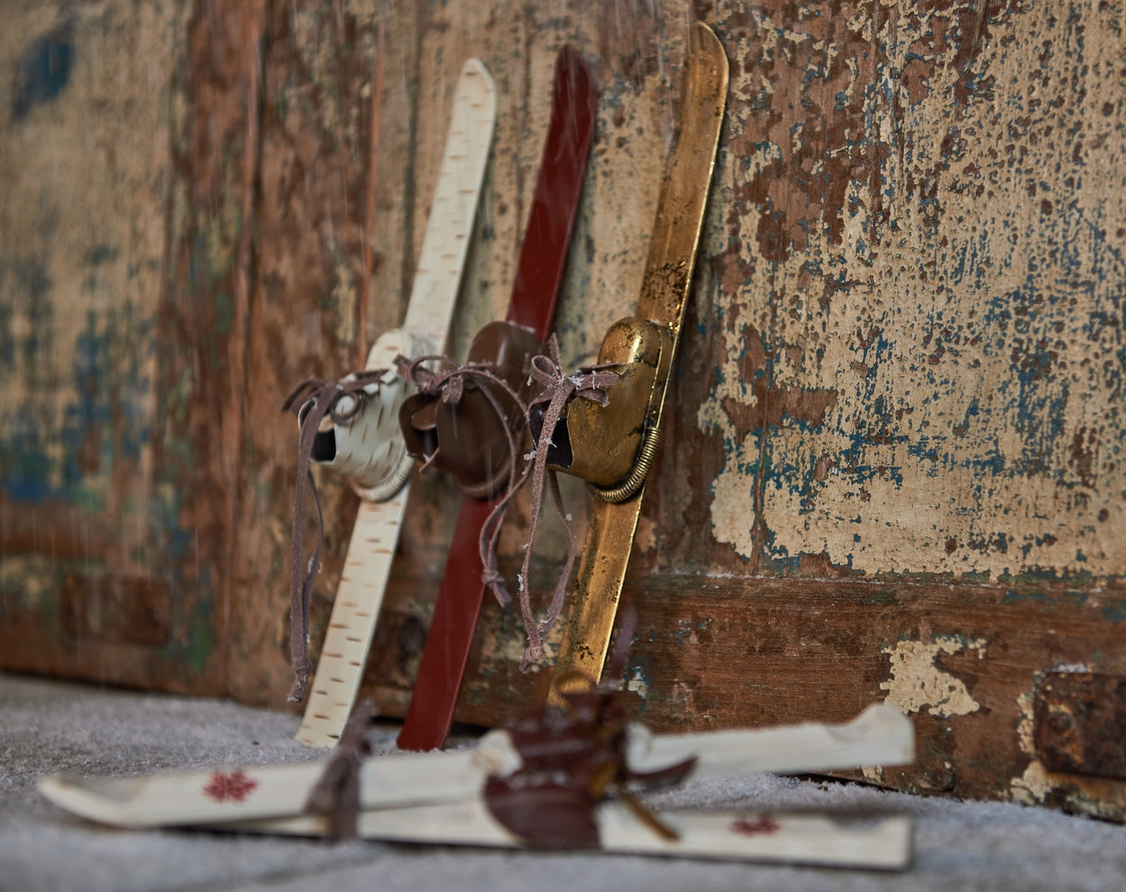Guld ski fra Speedtsberg - du får et sæt ski (2 stk). Størrelsen er 5x2x25 cm, de er lavet af metal.