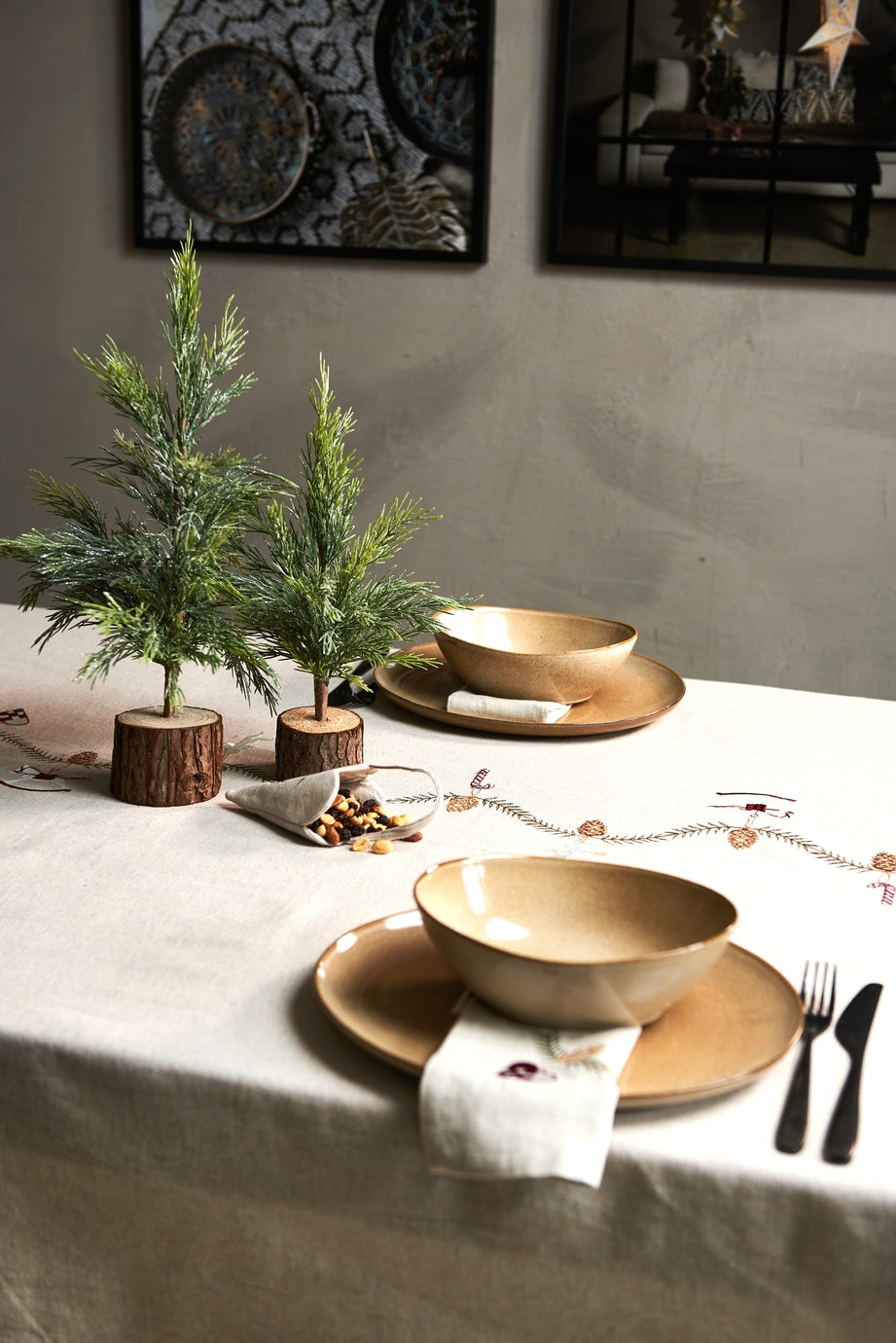 Den er lavet i 65 % bomuld / 35 % hør. I farven naturel.
