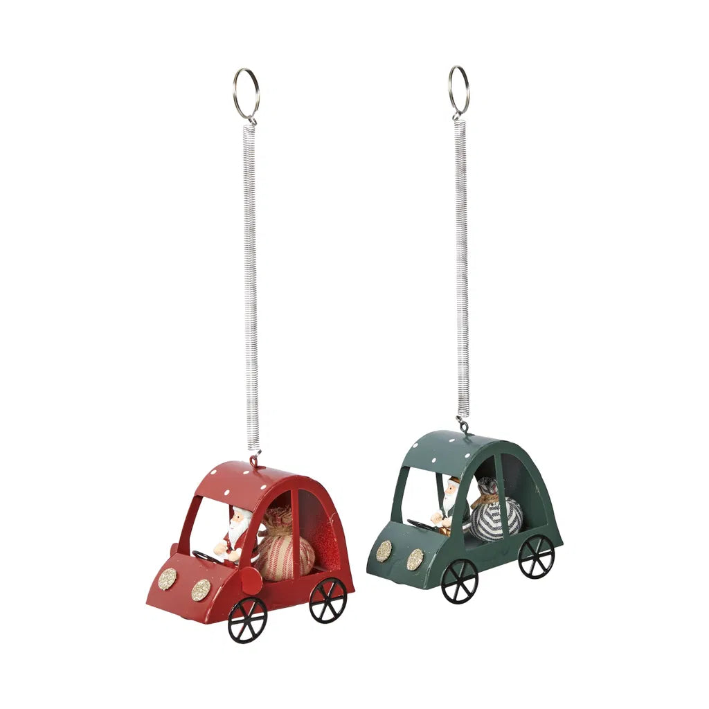 Julemand i bil i metal med fjeder ophæng. Søde at dekorere med.