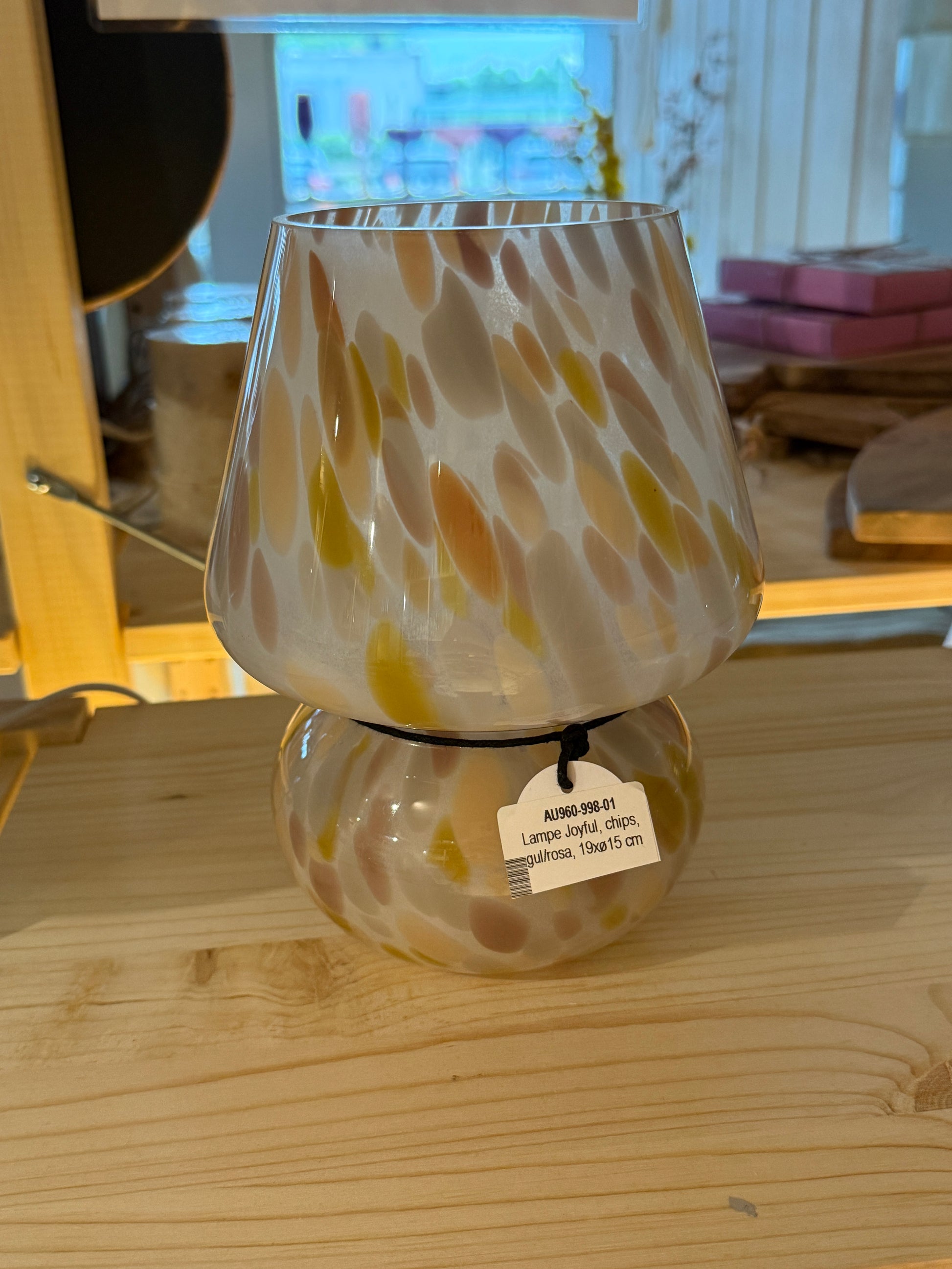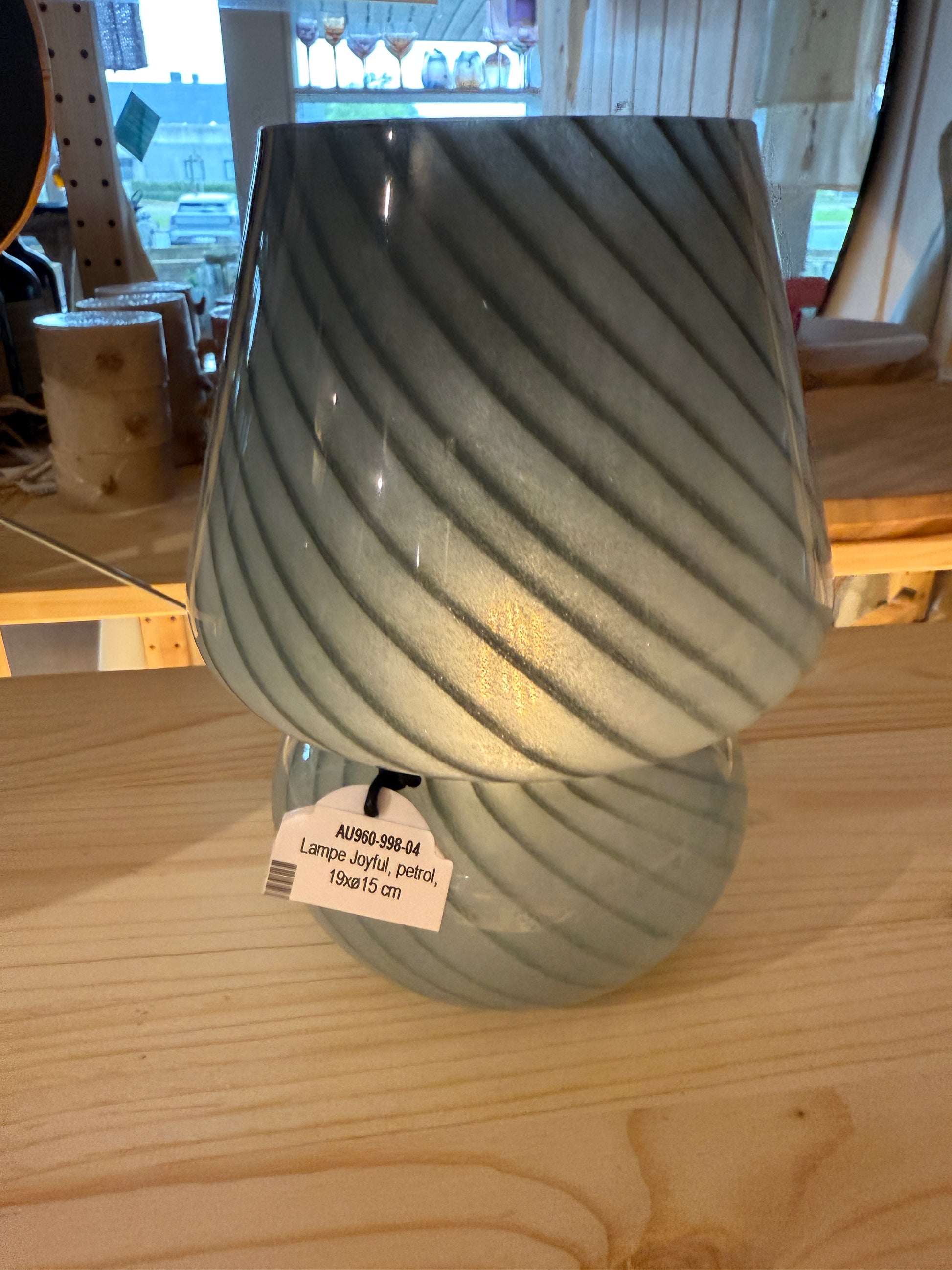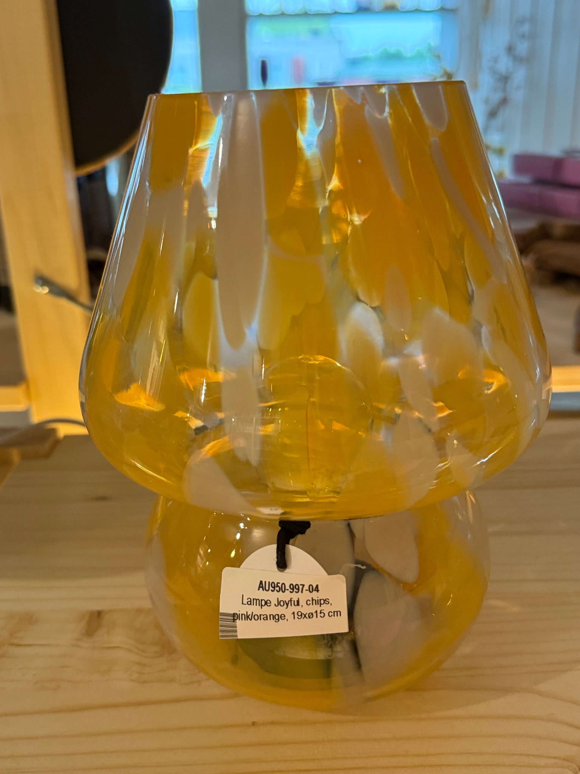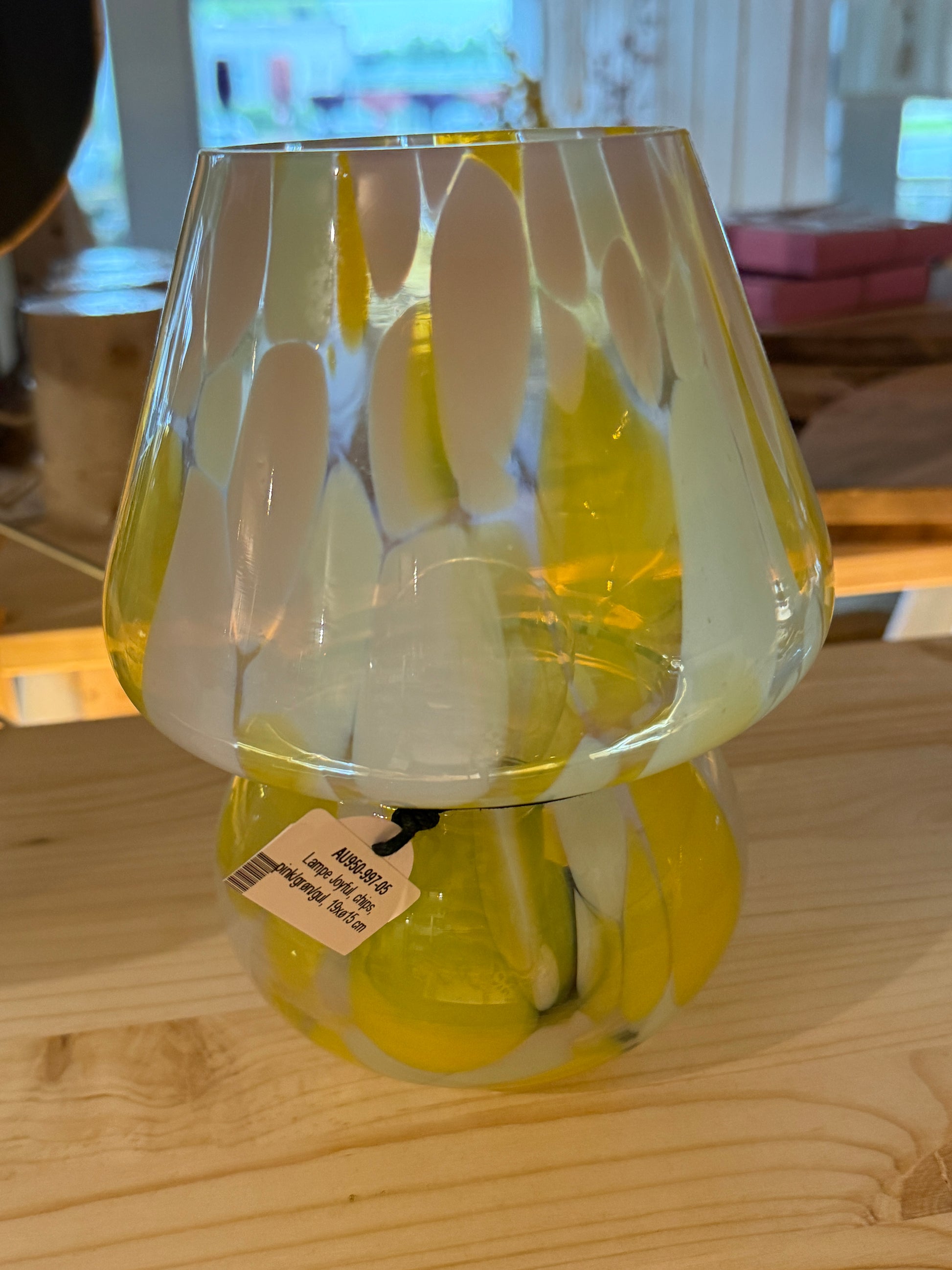 Den er 19 cm høj og 15 cm i diameter. De er med pære, men på batteri.