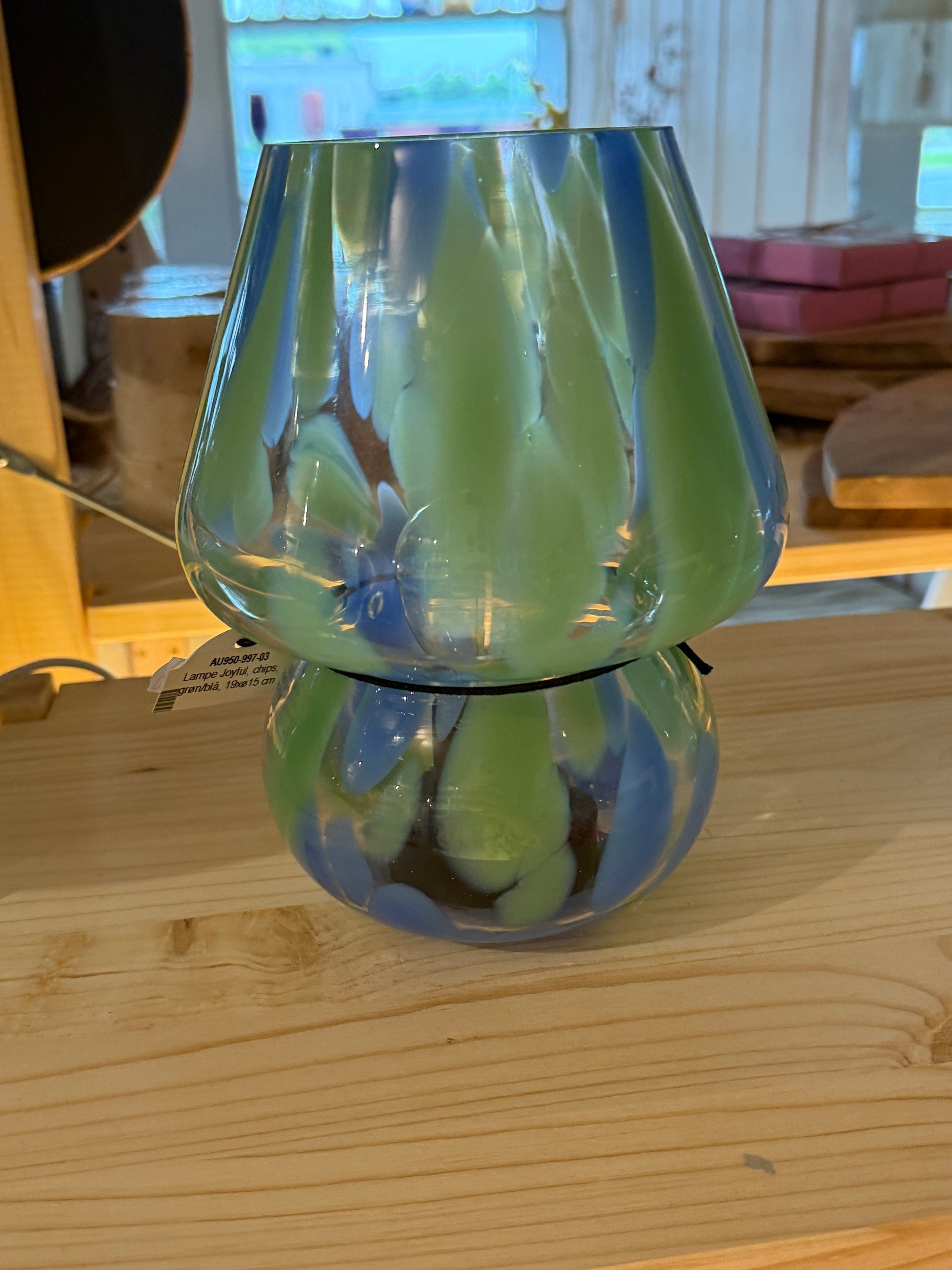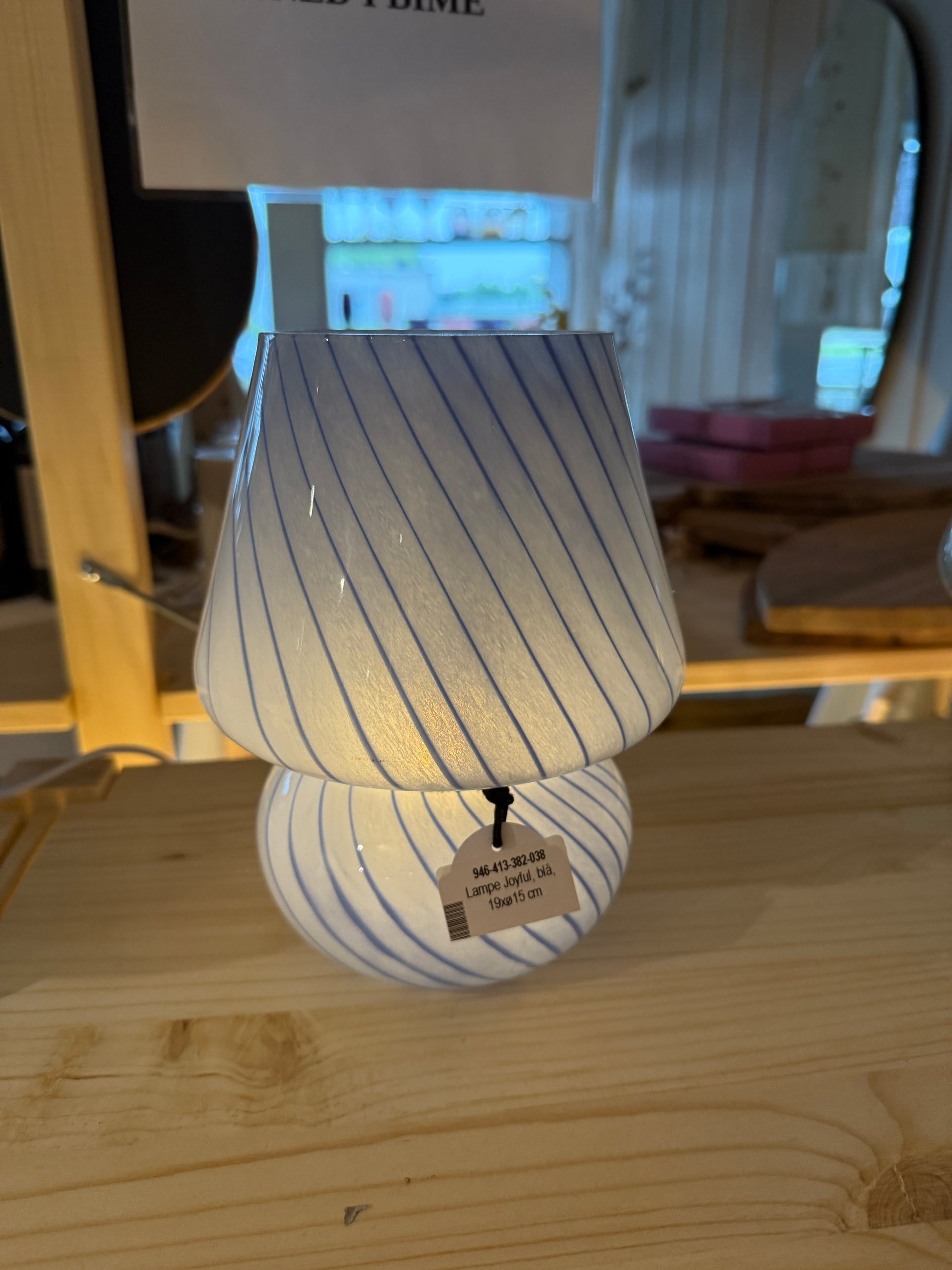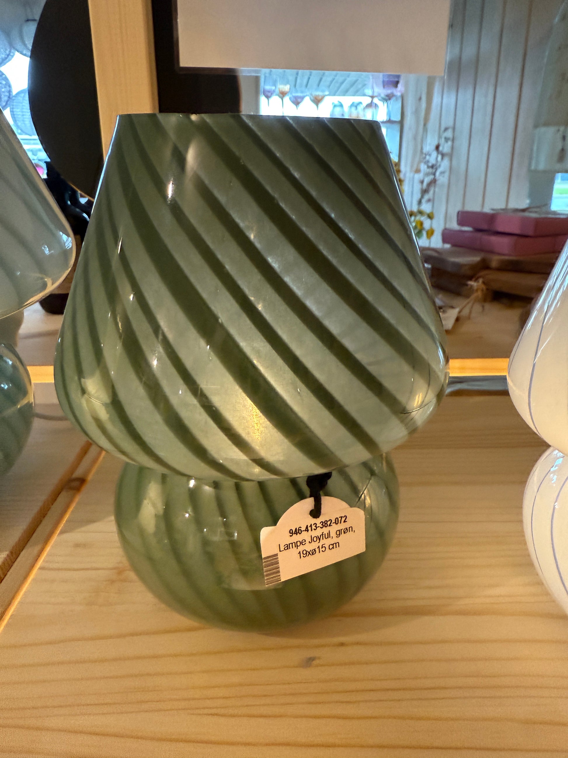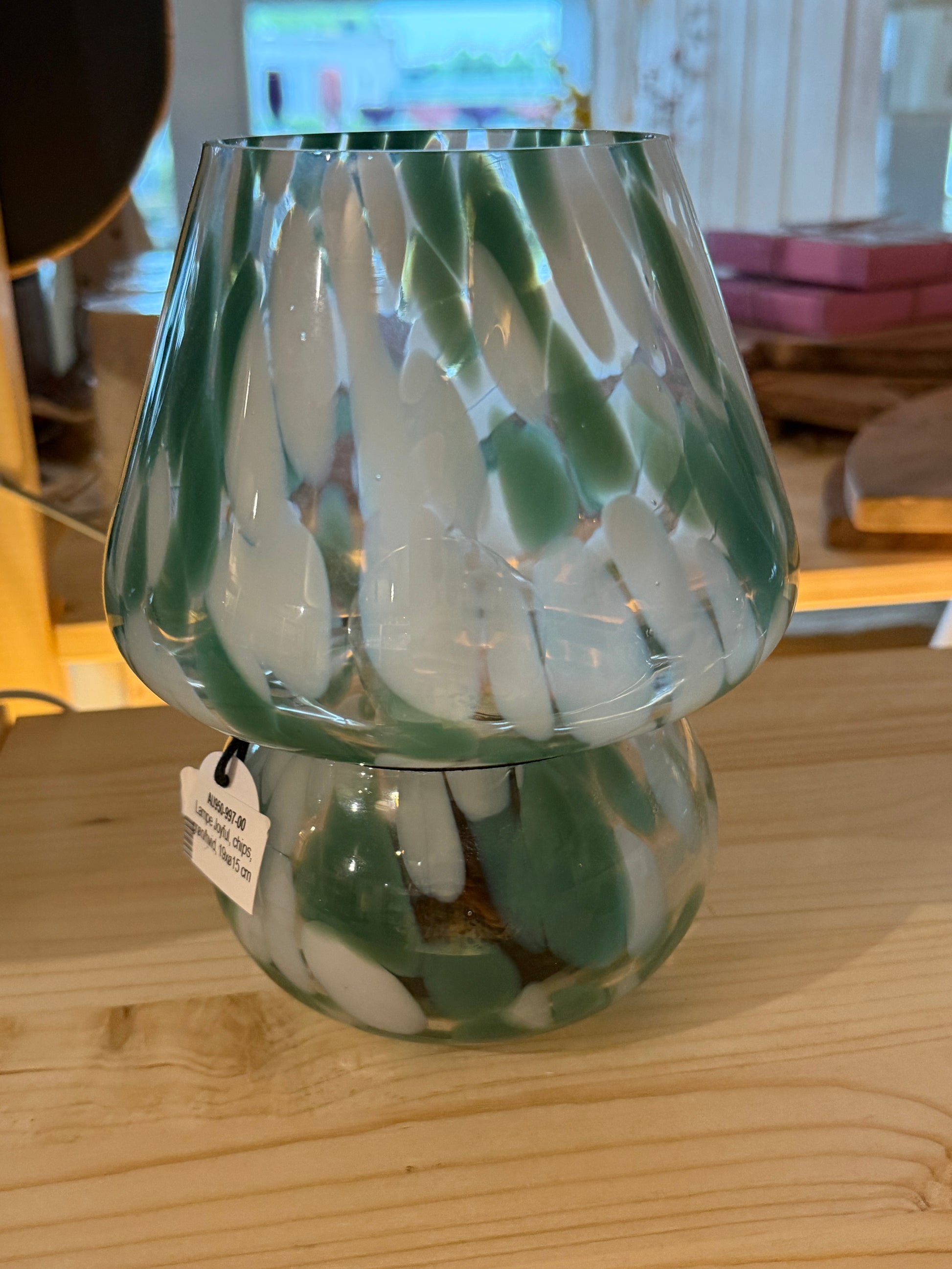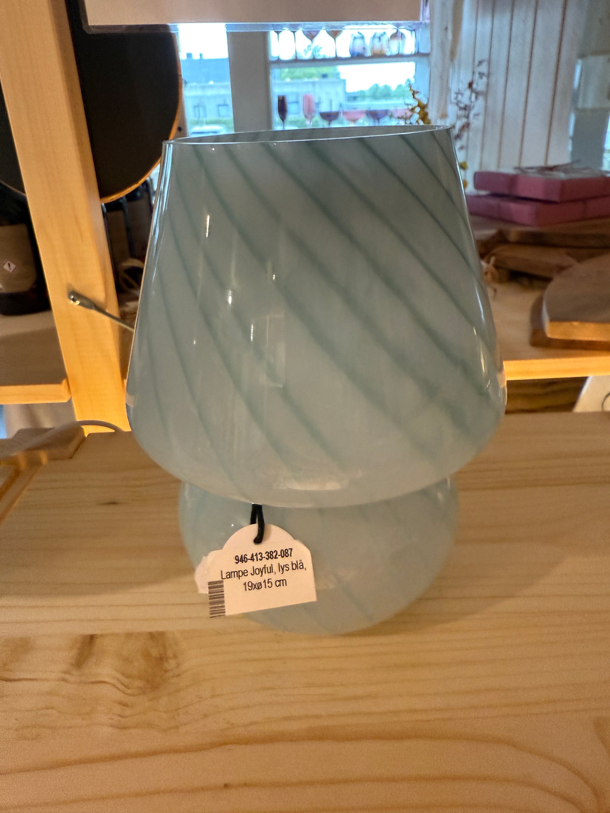 Den er 19 cm høj og 15 cm i diameter. De er med pære, men på batteri.