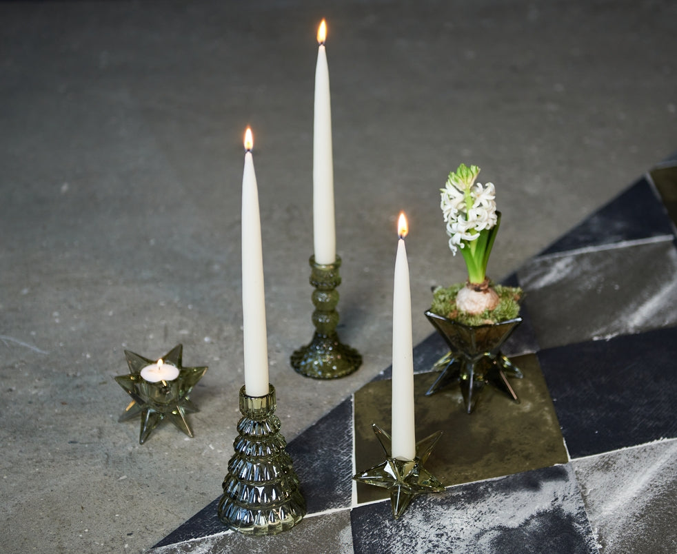 Fåes i farverne grøn og varm grå, de fåes både til fyrfads lys samt til krone lys.