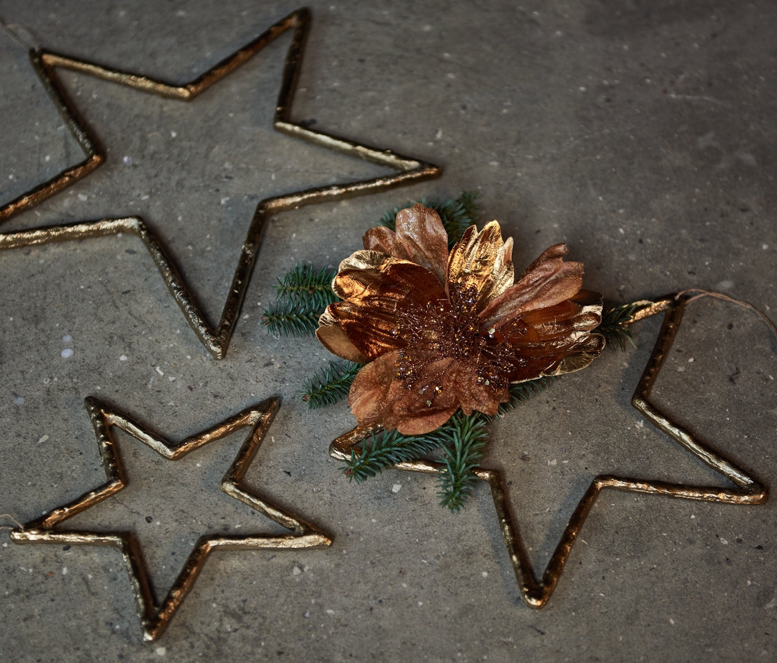 Smuk rustik stjerne til ophæng. Den er i flot antik guld farve. Vil pynte i ethvert vindue, enten som den er eller med lidt dekoration Fåes i 3 størrelser.